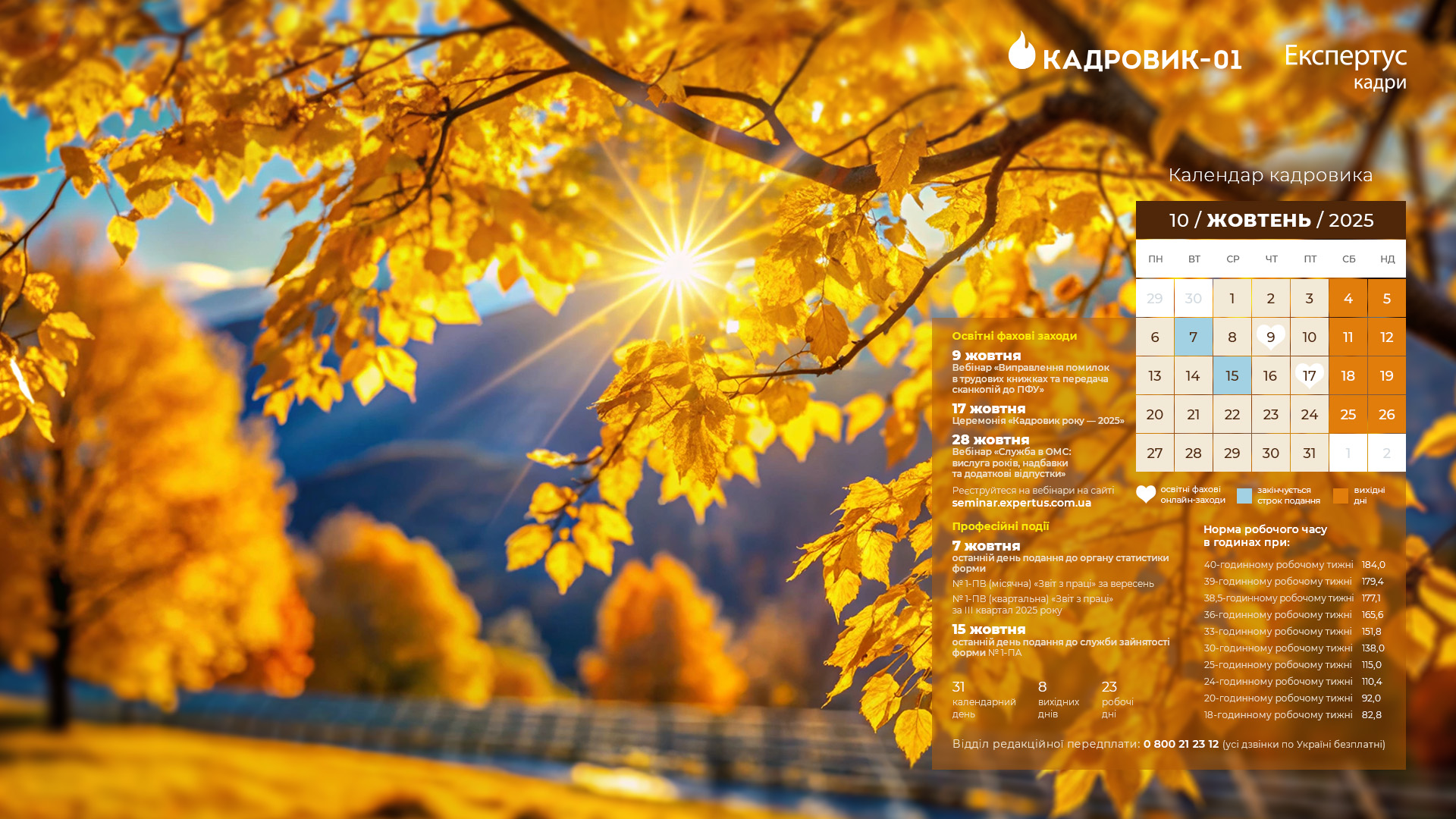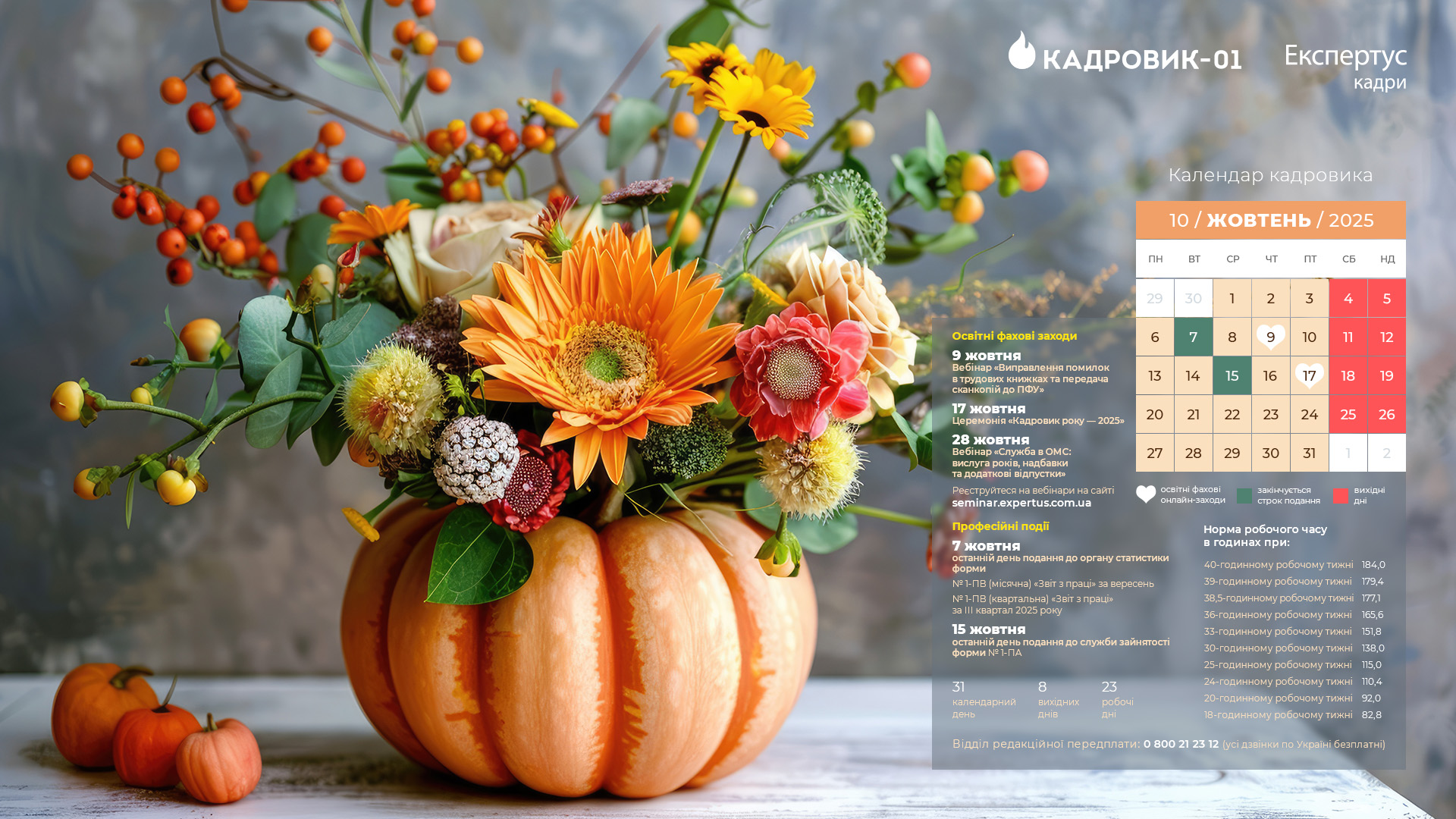 Календар кадровика жовтень 2025 допоможе швидко зорієнтуватися в робочих датах і не проґавити жоден звіт. Скористайтеся ним, щоб правильно визначити норму робочого часу жовтень 2025, розрахувати тривалість робочого часу у жовтні 2025 та вчасно підготувати всі звіти у жовтні 2025